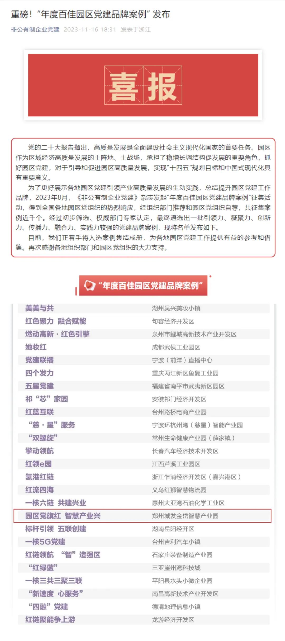 11月16日,由《非公有制企業(yè)黨建》雜志發(fā)起的“年度百佳園區(qū)黨建品牌案例”征集活動遴選結(jié)果揭曉。鄭州城發(fā)集團“園區(qū)黨旗紅 智慧產(chǎn)業(yè)興”基層黨建“書記項目”從近千個入圍案例中脫穎而出,成功入選“年度百佳園區(qū)黨建品牌案例”。