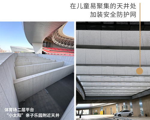 快樂成長,安全為先。為了確保兒童游樂區(qū)的安全,鄭州奧體中心從細(xì)節(jié)處著手精心加裝了多種防護(hù)裝置,在奧體中心西北角區(qū)域加裝隔離花箱、石墩,確保行人與機(jī)動(dòng)車分離。同時(shí),在體育場二層平臺兒童聚集較多的天井內(nèi),加裝防護(hù)網(wǎng);在健身器材一側(cè)加裝防護(hù)欄;在通往二層平臺的步梯兩側(cè)加裝防滑球......這些防護(hù)裝置均經(jīng)過嚴(yán)格的現(xiàn)場論證和質(zhì)量檢測,確保其具有優(yōu)異的耐用性和穩(wěn)定性。通過這些措施,鄭州奧體中心致力于為孩子們打造一個(gè)既充滿樂趣,又安全無虞的游樂環(huán)境。