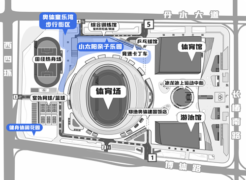奧體童樂灣步行街區(qū)西鄰田徑訓(xùn)練場,適合開展足球、慢跑、飛盤等親子運(yùn)動(dòng),南側(cè)配備有“奧體便民共享便利店”和衛(wèi)生間,向東可直達(dá)體育場二層平臺的“小太陽”網(wǎng)紅打卡地,不僅視野開闊,能一覽各場館建筑風(fēng)貌,還配備了攀爬架、沙坑、秋千等兒童玩樂項(xiàng)目。