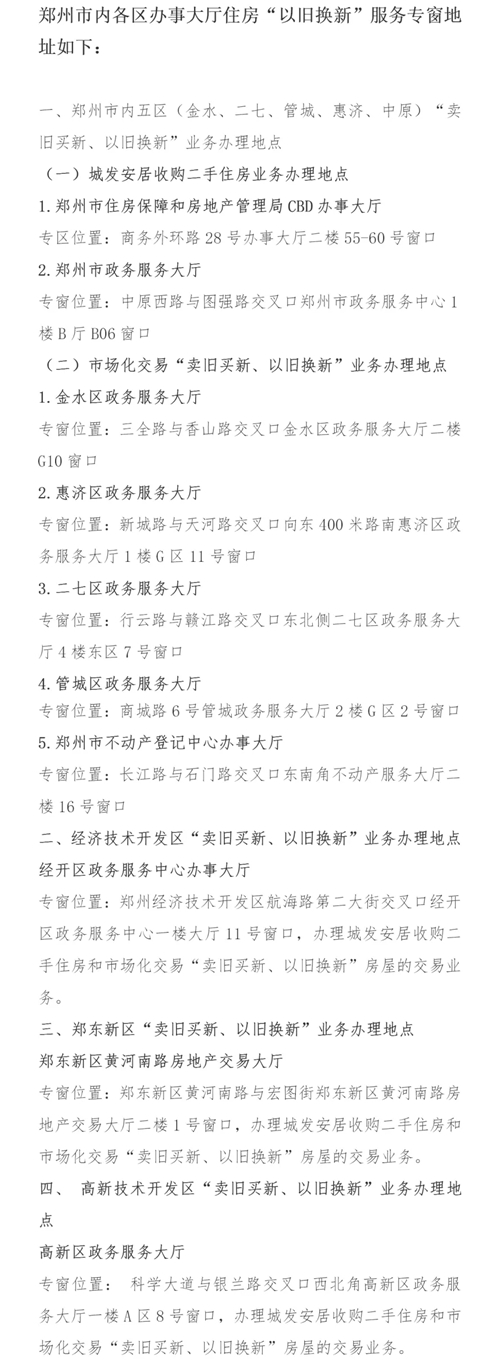 7月16日,記者從鄭州市房管局獲悉,為促進該市房地產(chǎn)市場“賣舊買新、以舊換新”政策進一步落實,鄭州市房管局會同稅務(wù)、不動產(chǎn)登記等部門,認真梳理工作流程、全面開設(shè)服務(wù)專區(qū),全力推進住房“以舊換新”工作。目前,鄭州市內(nèi)8區(qū)10個辦事大廳均開設(shè)“以舊換新”服務(wù)專窗,辦理相關(guān)業(yè)務(wù)可享受“專人專窗”的服務(wù)。