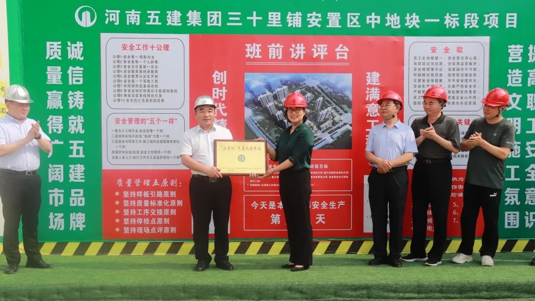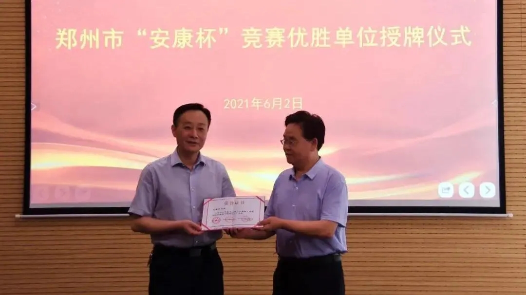 6月2日下午,鄭州市總工會(huì)機(jī)關(guān)工會(huì)主任王銀倉、市總工會(huì)勞動(dòng)和經(jīng)濟(jì)部部長宋慧分別向集團(tuán)兩家獲獎(jiǎng)公司頒發(fā)鄭州市“安康杯”競(jìng)賽優(yōu)勝單位獎(jiǎng)牌。