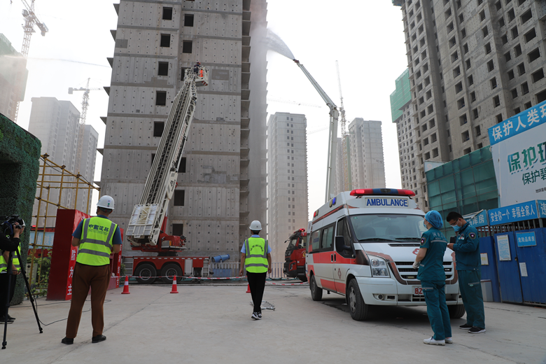 啟動(dòng)儀式上,在工地現(xiàn)場(chǎng)開(kāi)展了消防救援應(yīng)急演練。該環(huán)節(jié)模擬施工現(xiàn)場(chǎng)發(fā)生火災(zāi)時(shí),現(xiàn)場(chǎng)管理人員應(yīng)急操作反應(yīng)及配合市消防救援支隊(duì)展開(kāi)滅火救援的案例。演練現(xiàn)場(chǎng)火災(zāi)模擬真實(shí)生動(dòng),4部消防車(chē)、1部救援車(chē)、1部救護(hù)車(chē)實(shí)地奔赴現(xiàn)場(chǎng)開(kāi)展滅火及救援。整個(gè)演練過(guò)程現(xiàn)場(chǎng)組織嚴(yán)密、人員到位快速、操作程序得當(dāng),達(dá)到了預(yù)期效果。宣誓環(huán)節(jié),由中建二局三公司代表引領(lǐng)各參賽單位代表共同開(kāi)展安全宣誓。趙新中為各參賽單位授旗。